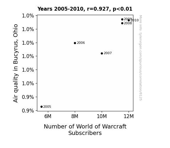 This means 85.9% of the change in the one variable (i.e., Number of World of Warcraft Subscribers) is predictable based on the change in the other (i.e., Air quality in Bucyrus, Ohio) over the 6 years from 2005 through 2010.
