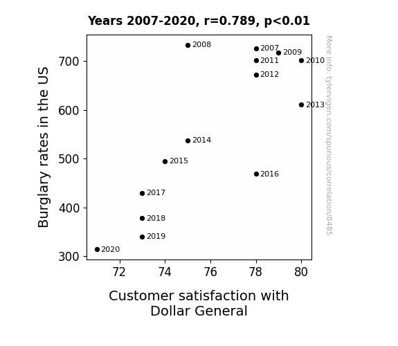 This means 62.2% of the change in the one variable (i.e., Customer satisfaction with Dollar General) is predictable based on the change in the other (i.e., Burglary rates in the US) over the 14 years from 2007 through 2020.
