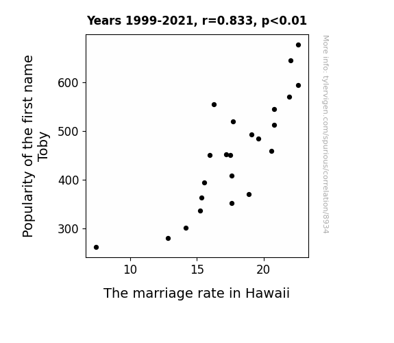 This means 69.4% of the change in the one variable (i.e., The marriage rate in Hawaii) is predictable based on the change in the other (i.e., Popularity of the first name Toby) over the 23 years from 1999 through 2021.