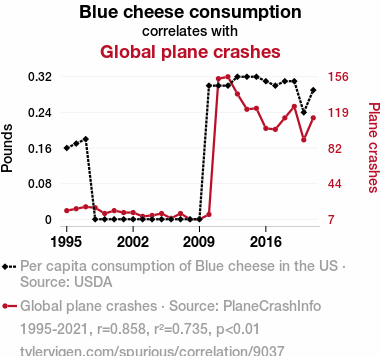 no direct connection between these variables, despite what the AI says above. This is exacerbated by the fact that I used "Years" as the base variable. Lots of things happen in a year that are not related to each other! Most studies would use something like "one person" in stead of "one year" to be the "thing" studied. - Observations not independent: For many variables, sequential years are not independent of each other. If a population of people is continuously doing something every day, there is no reason to think they would suddenly change how they are doing that thing on January 1. A simple