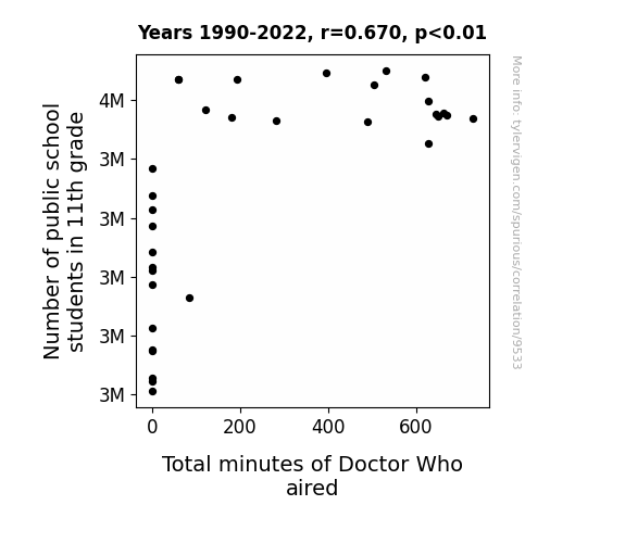 This means 44.9% of the change in the one variable (i.e., Total minutes of Doctor Who aired) is predictable based on the change in the other (i.e., Number of public school students in 11th grade) over the 33 years from 1990 through 2022.